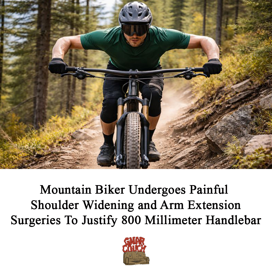 BEND, Ore. — Local mountain biker Trent Wontcut underwent a series of aggressive and medically unnecessary orthopedic surgeries this week to justify his commitment to 800 millimeter handlebars, which experts, friends and anyone with eyes agree are far too wide for his 5 foot 8 frame. Wontcut confirmed from a hospital bed that the procedures were “worth it” because the bars make him feel “way more stable,” despite the fact that he now resembles a startled orangutan struggling to hold a shopping cart.