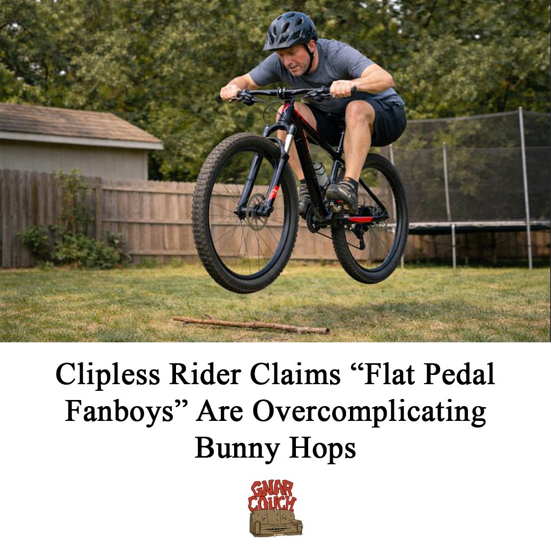 Asheville, NC — A local mountain biker who pedals “very efficiently” but cannot demonstrably jump a bicycle insisted this week that flat-pedal riders are dramatically overcomplicating bunny hops by involving unnecessary steps such as bike compression, timing, and physics.