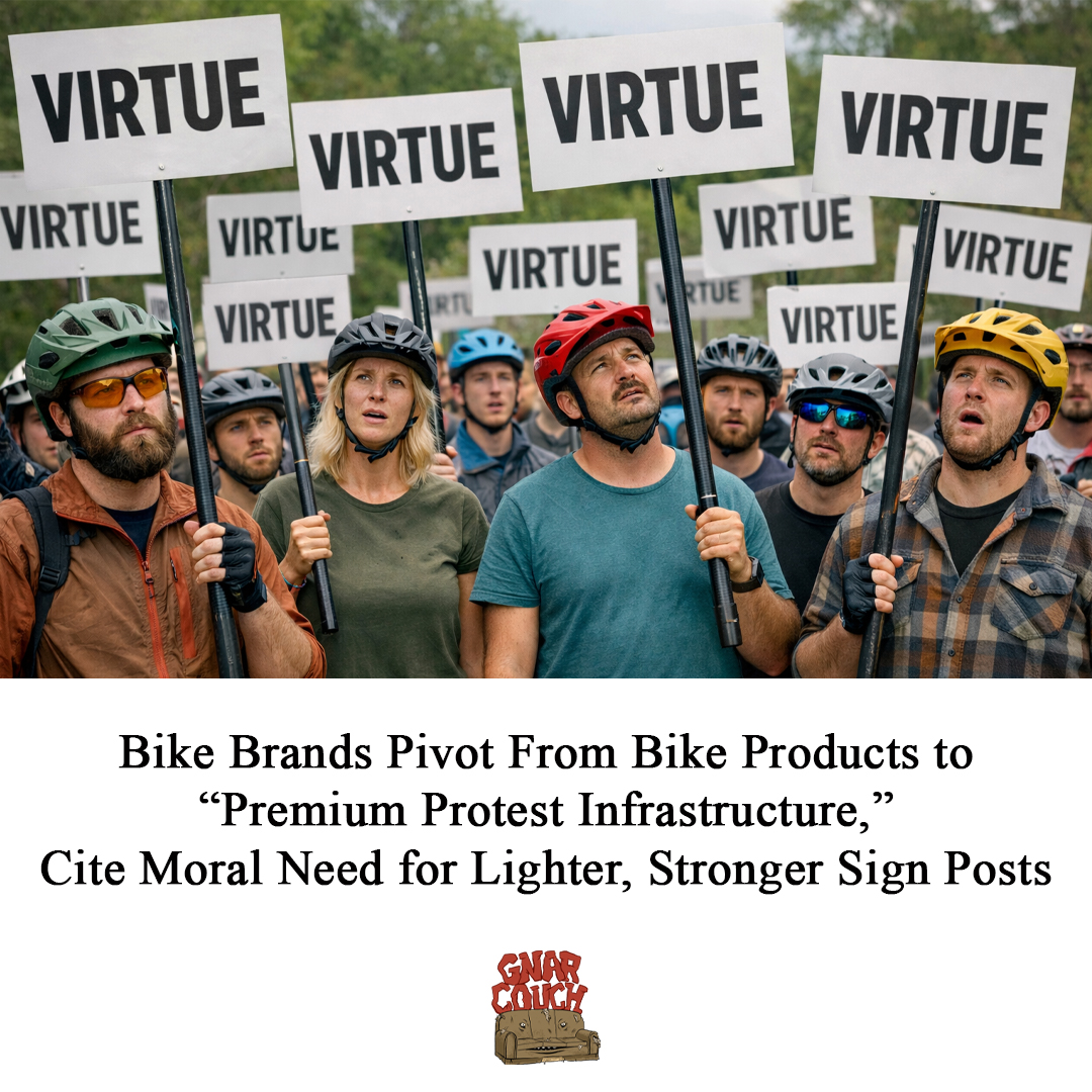 BLOOMINGTON, Minn. — Several high-end cycling brands announced this week they are suspending bicycle manufacturing to produce what executives describe as “structurally superior protest sign posts,” citing an urgent cultural moment that, they say, demands high-tolerance materials.